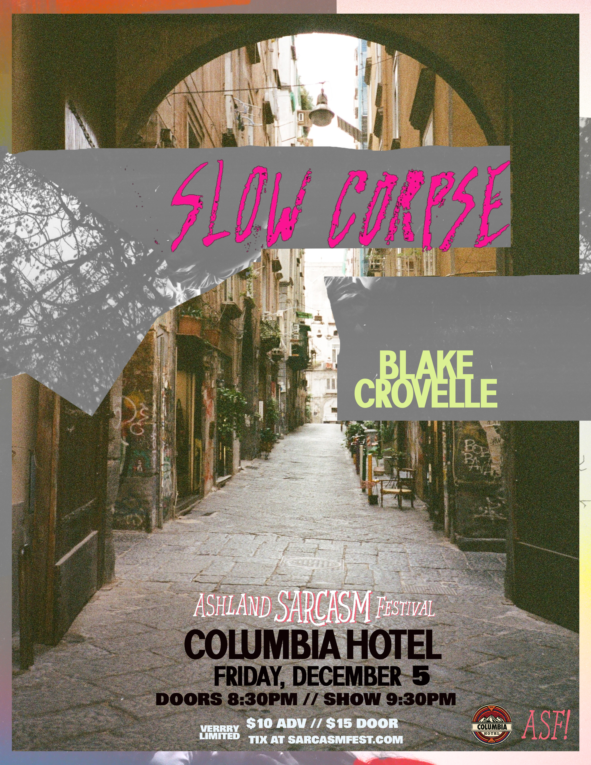 Start your Sarcasm Fest weekend with live music at The Columbia Hotel! Two incredible acts bring the energy with back-to-back performances. Slow Corpse and Blake Corvelle deliver the perfect soundtrack to kick off your Friday night before hitting the late-night comedy circuit downtown.
